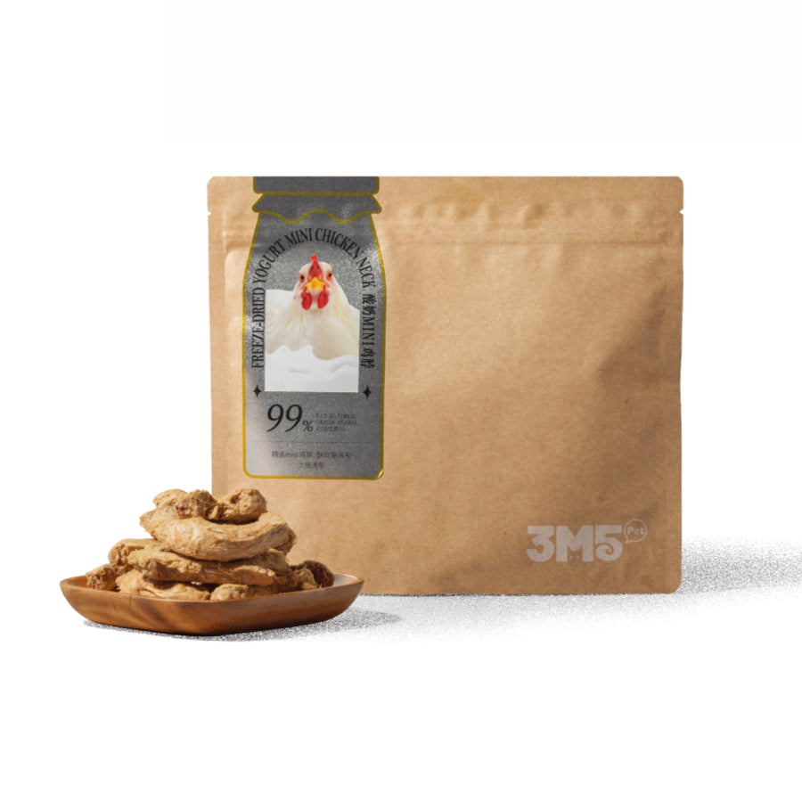 Specially crafted in a MINI size, these chicken necks are easier to chew and perfectly suited for cats and small-breed dogs. The addition of sugar-free yogurt not only helps soften the bones to reduce splintering risk, but it also enhances palatability and supports dental cleaning during chewing. Yogurt is naturally rich in probiotics, providing digestive support and promoting healthy gut balance. With 3M5’s proprietary 50-hour freeze-drying process, these treats retain natural flavor, aroma, and nutrients — creating a safe, highly digestible, and irresistible snack for pets.