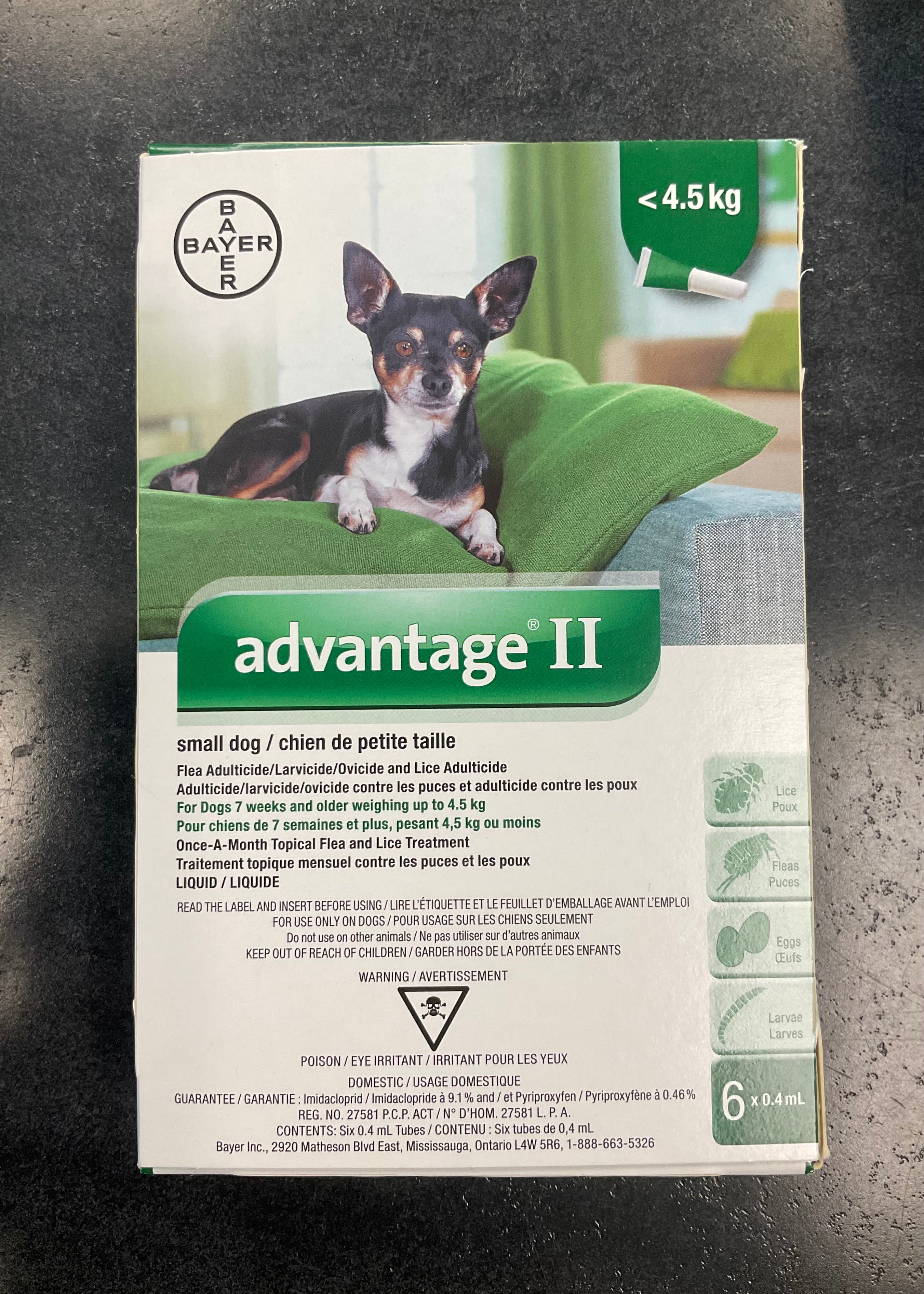 Advantage® II is a monthly topical flea control for dogs that kills fleas through contact, so fleas do not have to bite to die. Advantage® II kills fleas rapidly within 12 hours of initial application. Reinfesting fleas are killed within 2 hours with protection against further flea infestation lasting for up to a month. Pyriproxyfen provides the additional benefit of killing flea eggs and larvae to effectively break the flea life cycle. For use on dogs and puppies 7 weeks of age and older, weighing 3 lbs. or more.