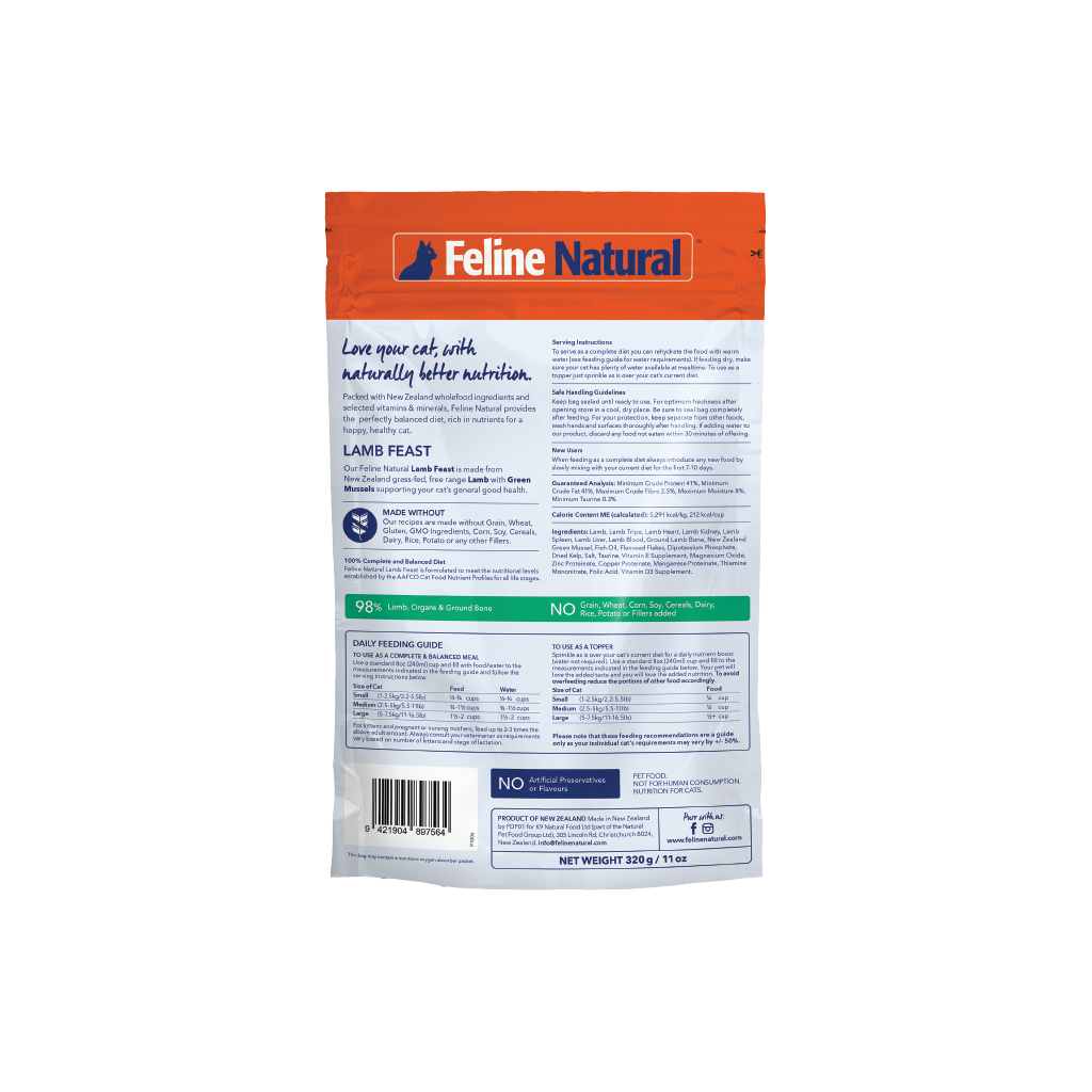 Made in New Zealand with grass-fed, free-range lamb, the rich proteins and omega 3 fatty acids assist a cat's natural anti-inflammatory responses and supports healthy joints, muscles and mobility.