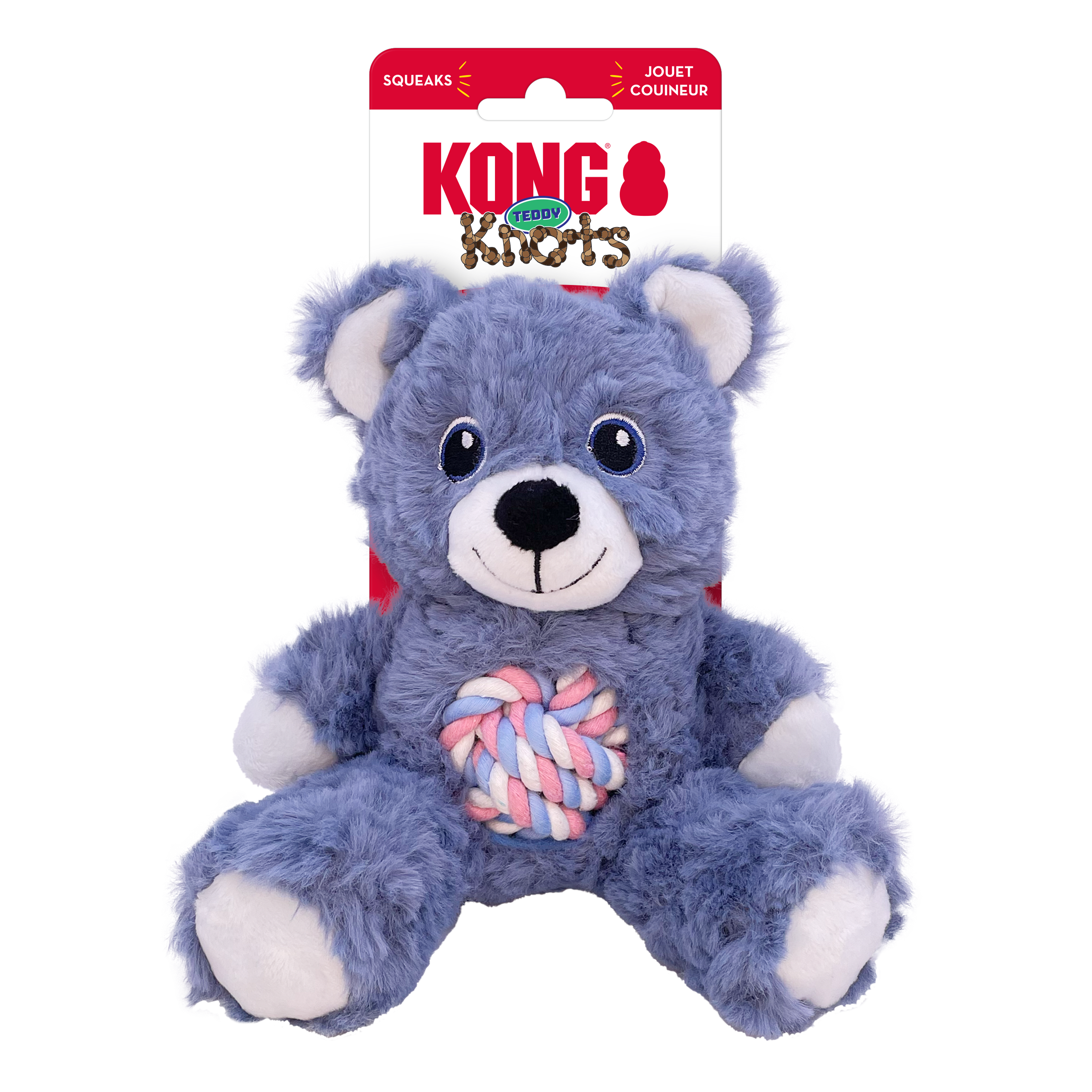 KONG Knots Teddy’s durable knotted rope tummy and tail satisfy natural instincts and make it easy for dogs to pick him up to play for fetching and shaking fun. Squeaker keeps play going. Irresistibly cozy plush and a soft snuggly body invite comforting cuddles when it’s time for a bit of quiet hibernation.