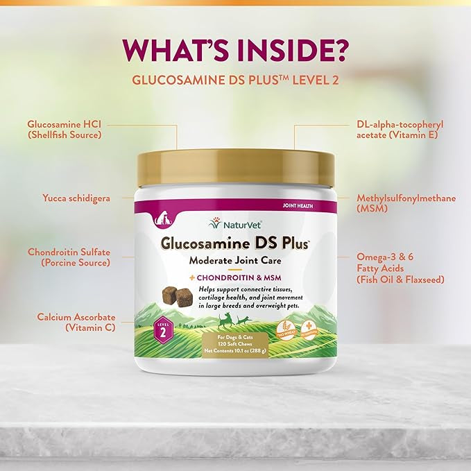 Formulated with Glucosamine, MSM, Chondroitin, and antioxidants to support connective tissue, cartilage health, joint movement, and lubrication of joints. Recommended for adult pets, including large breeds and overweight pets.