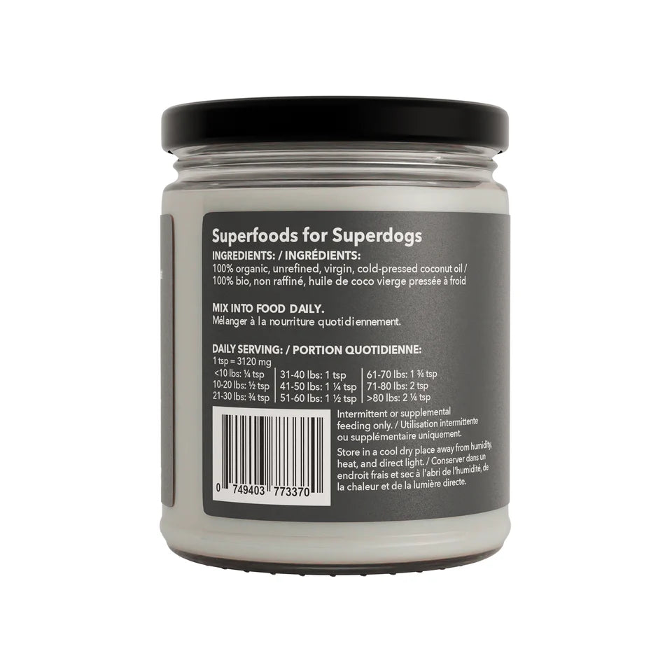 A whole food product for your dog. 100% organic unrefined, virgin, cold-pressed coconut oil. This is a very popular super food for people and dogs. It's full of saturated fats and most of them come from Medium Chain Triglycerides also known as MCTs. This is where the most benefits are. One of the fatty acids in MCT is lauric acid and it may have antibacterial, antiviral and anti-fungal properties.
