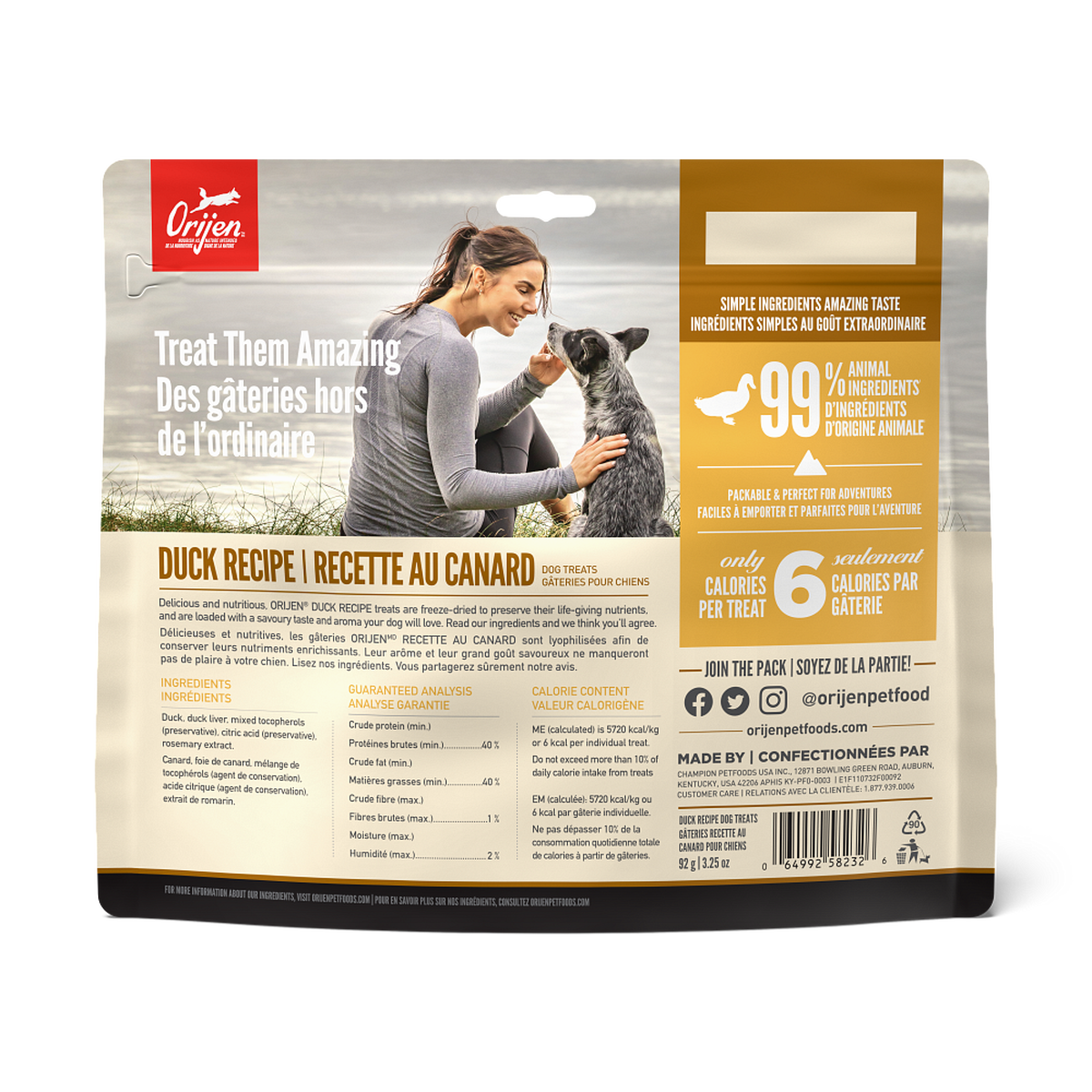 Treat your dog to delicious and nutritious ORIJEN® Freeze-Dried Treats. Packed with animal protein, our Duck Recipe is made with 99%* animal ingredients including nourishing duck and liver. Freeze-dried to lock in their rich nutrients and flavour, they’re packable and perfect for adventures. At just six calories each, ORIJEN Freeze-Dried Treats are loaded with protein and amazing taste.