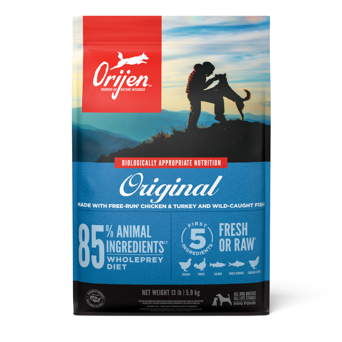 Help your dog thrive with the power of protein-rich recipes that provide peak nourishment. Dogs are ancestral carnivores, so they need a Biologically Appropriate diet packed with whole animal ingredients. ORIJEN® Original diet is crafted with 85%* quality animal ingredients like fresh or raw free-run** chicken and turkey and wild-caught fish. Packed with WholePrey animal ingredients like organs and bone, ORIJEN food is made with the most nutrient-dense, succulent parts of the prey to deliver the nutrition dogs need. The nourishing animal ingredients in ORIJEN Original diet help support your dog’s Immune Health, Skin & Coat Health and Digestive Health. The result is a diet for your canine companion that is beyond comparison.
