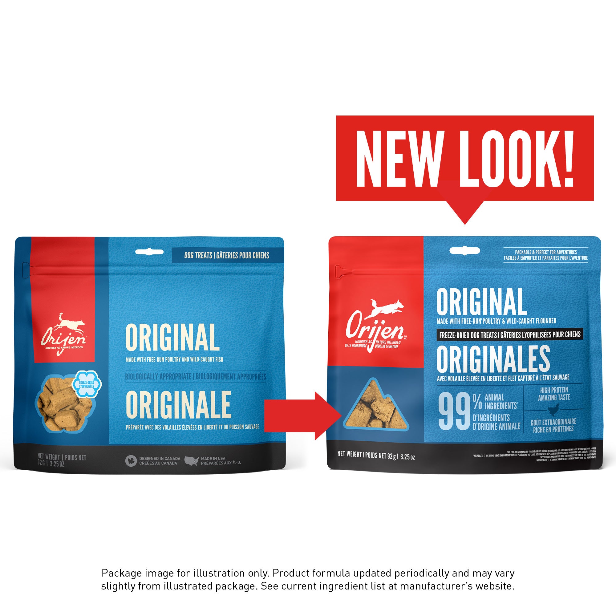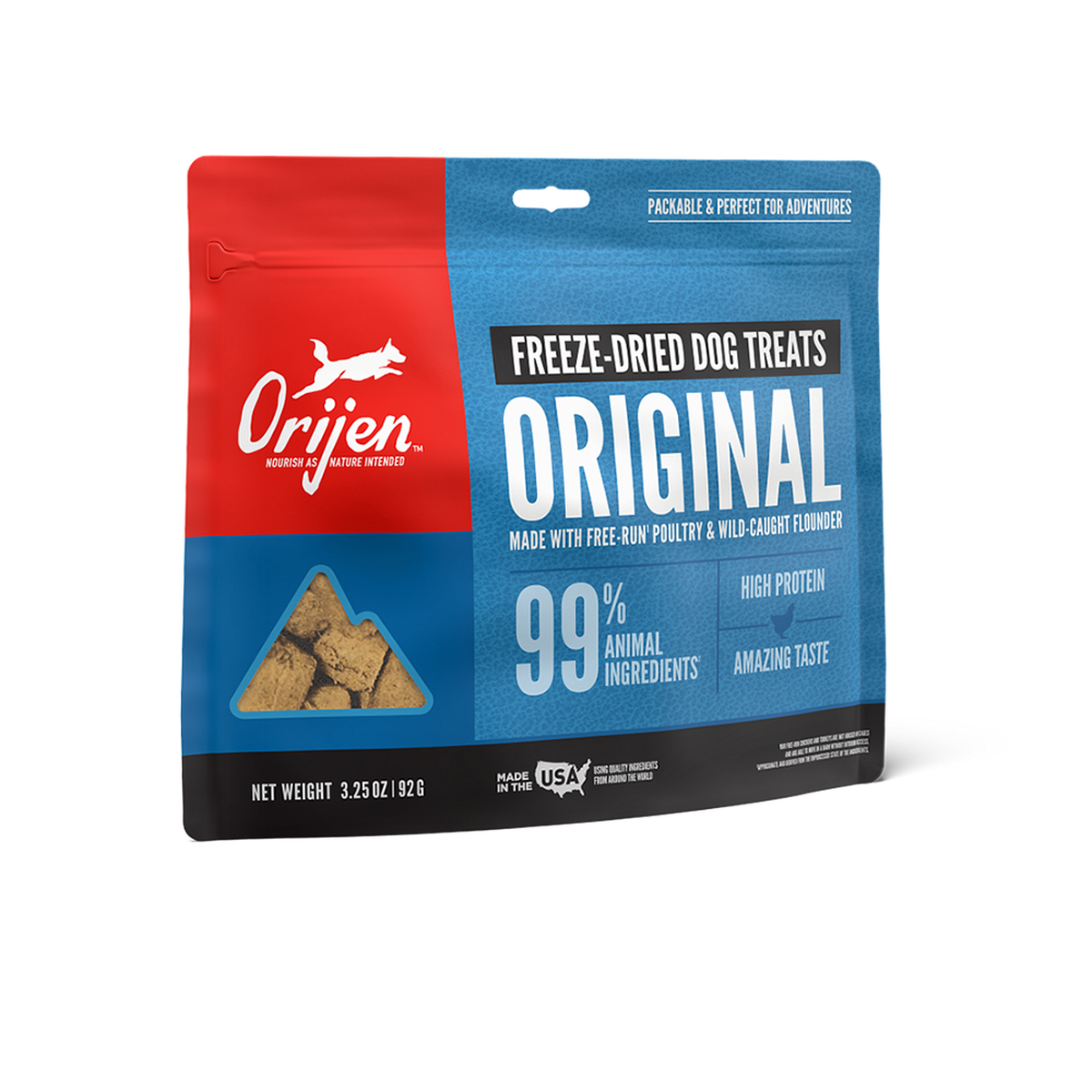 Treat your dog to delicious and nutritious ORIJEN® Freeze-Dried Treats. Packed with animal protein, our Original Recipe is made with 99%1animal ingredients including nourishing free-run2 poultry and wild-caught flounder. Freeze-dried to lock in their rich nutrients and flavor, they’re packable and perfect for adventures. At just five calories each, ORIJEN Freeze-Dried Treats are loaded with protein and amazing taste.