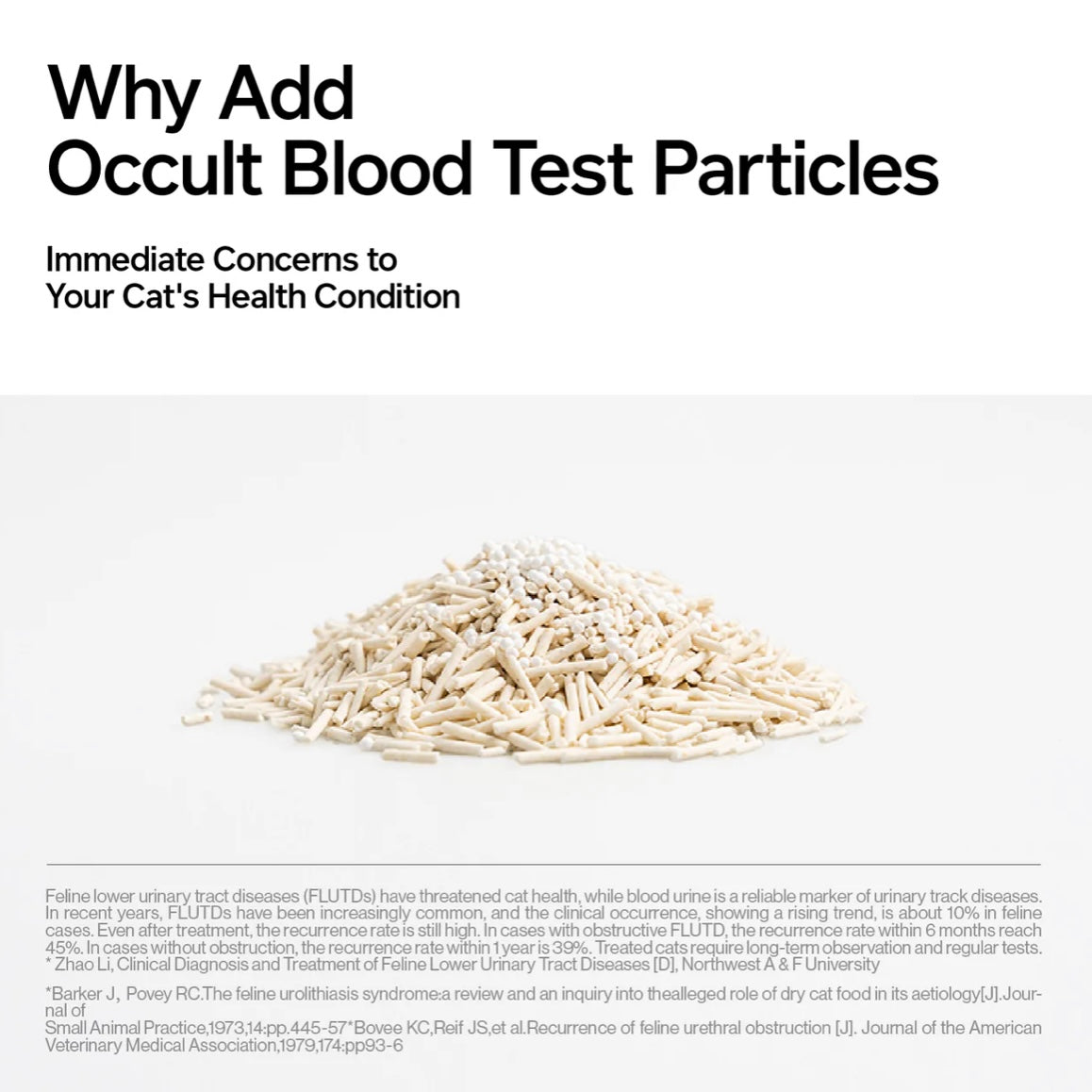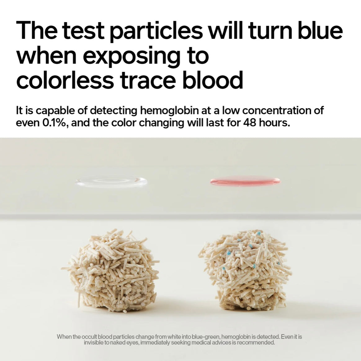 Note: The occult blood test particles are made of microcrystalline cellulose which is extracted from wood pulp and pure cotton, so it is natural. Microcrystalline cellulose is widely used in pharmacy, cosmetics, food, and other industries, so it is a relatively non-toxic and non-irritating substance. It will not be absorbed by the body when digested. The occult blood test particles are confirmed effective in testing blood in urine and have no reports on harming cats and the environment after research and development.