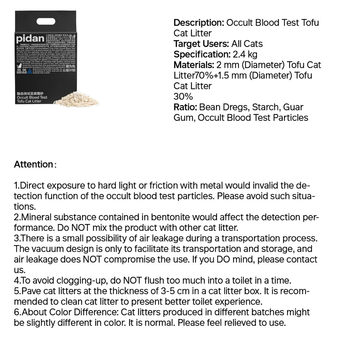 *Mixing the upgraded version with other types of cat litter other than tofu cat litter will only affect the ability to detect hemoglobin. Everything else remains the same. So, when the upgraded version tofu loses the ability to detect hemoglobin, the upgraded version tofu would just be the original tofu cat litter.