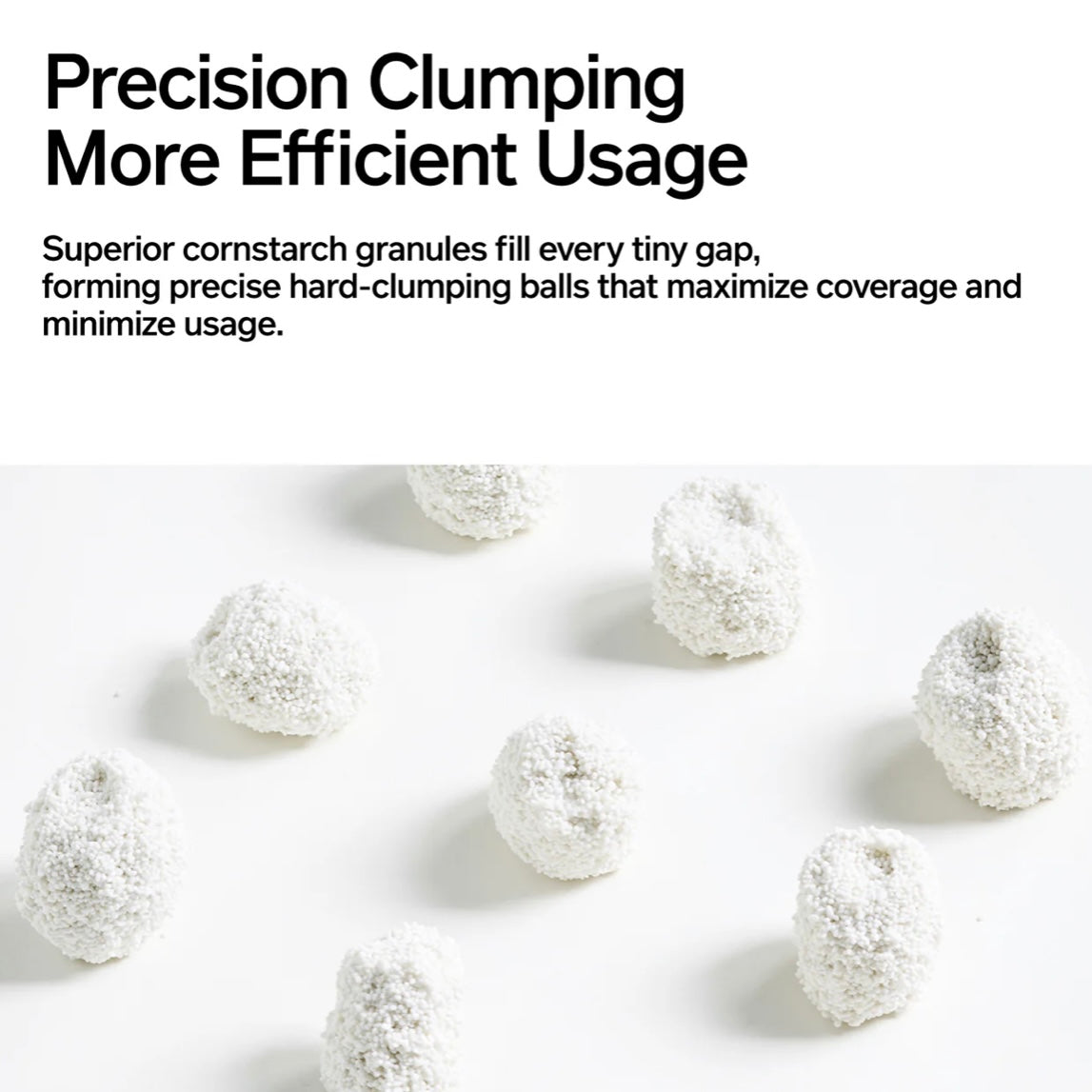 Superior cornstarch granules fill every tiny gap, forming precise hard-clumping balls that maximize coverage and minimize usage