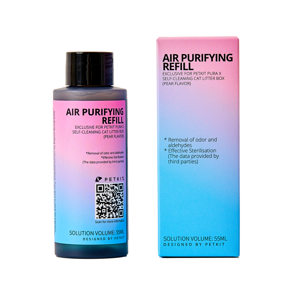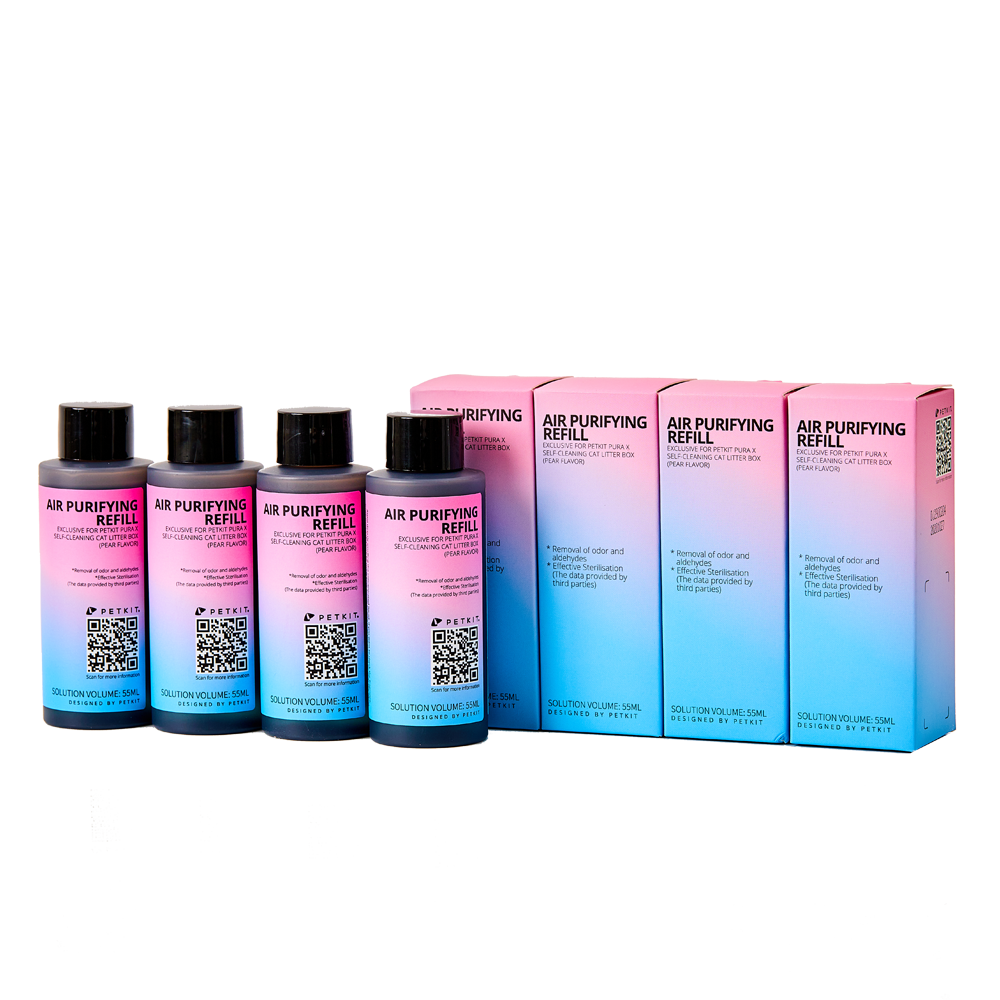 The purifying refill solution is non-toxic and made from raw materials that are safe for use around pets. It also contains plant extracts that safely decomposes ammonia and hydrogen sulfides found in cat waste. The refill bottles are 55mls, which can last roughly around 30 days for a single cat household.