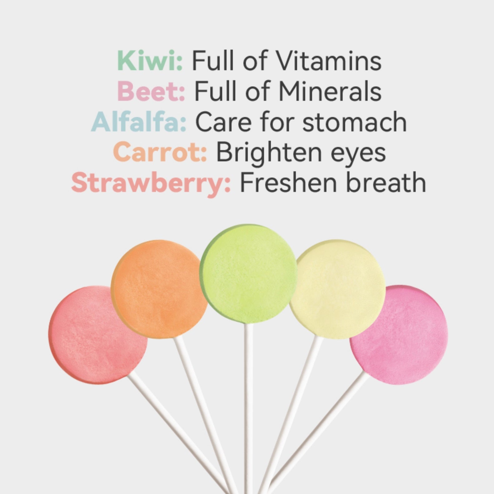 • Kiwi Flavor 1.4g x3; Beet Flavor  1.4g x3; Alfafa Flavor 1.4g x3; Carrot Flavor 1.4g x3; Strawberry Flavor  1.4g x3