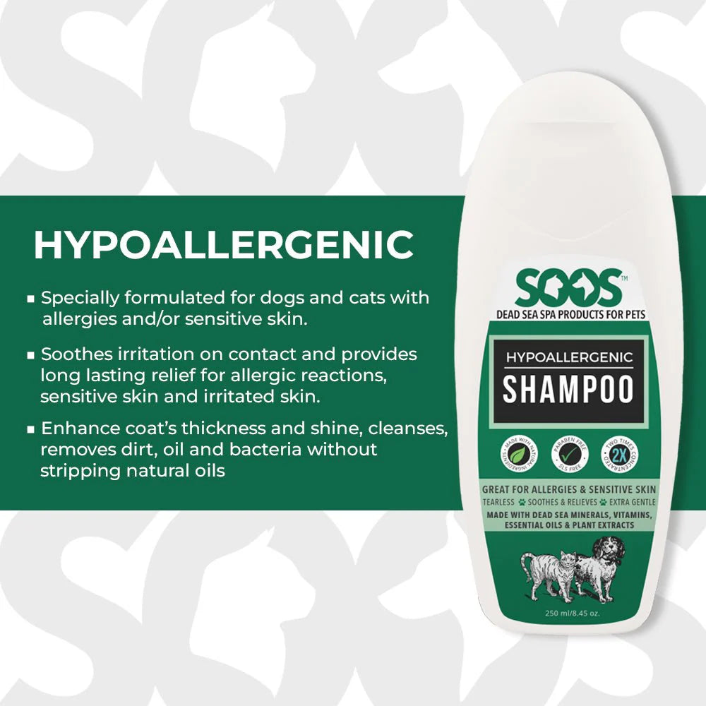 Just what the vet ordered (without the expensive trip there!)  Stop painful rashes, discomfort and allergic dermal reactions immediately. Soos™ Natural Hypoallergenic Shampoo is specially formulated for dogs and cats with allergies and for pets with sensitive skin or chronic skin conditions. It acts as a long-term solution while simultaneously providing fast acting relief for irritated skin. Its no tears formula is so gentle that it will not irritate eyes or other sensitive areas.