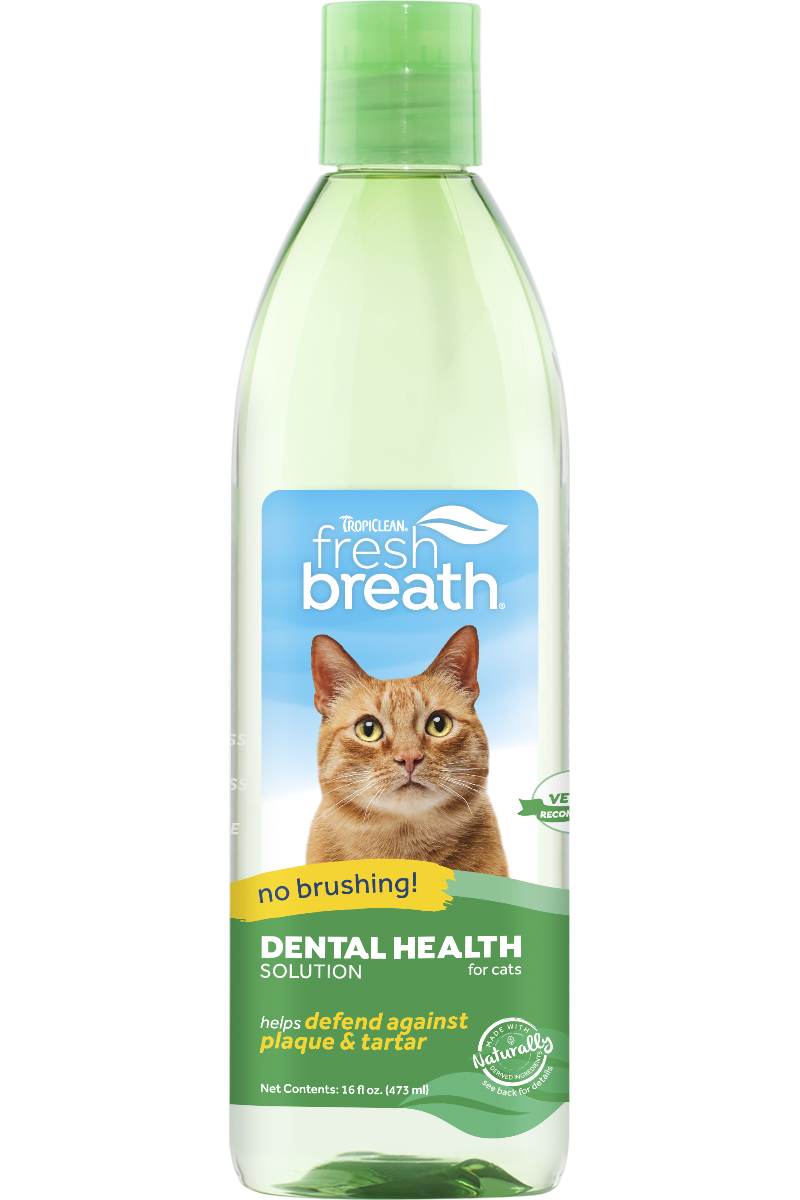 Cleaning your pet’s teeth is about more than just getting their pearly whites to sparkle – it’s an important step in their overall health and wellness. With TropiClean Fresh Breath Dental Health Solution for Cats, cats can benefit from daily plaque and tartar defense, simply by drinking from their water bowl. Easy-to-use water additive gives your cat clean teeth and fresh breath—no brushing required!