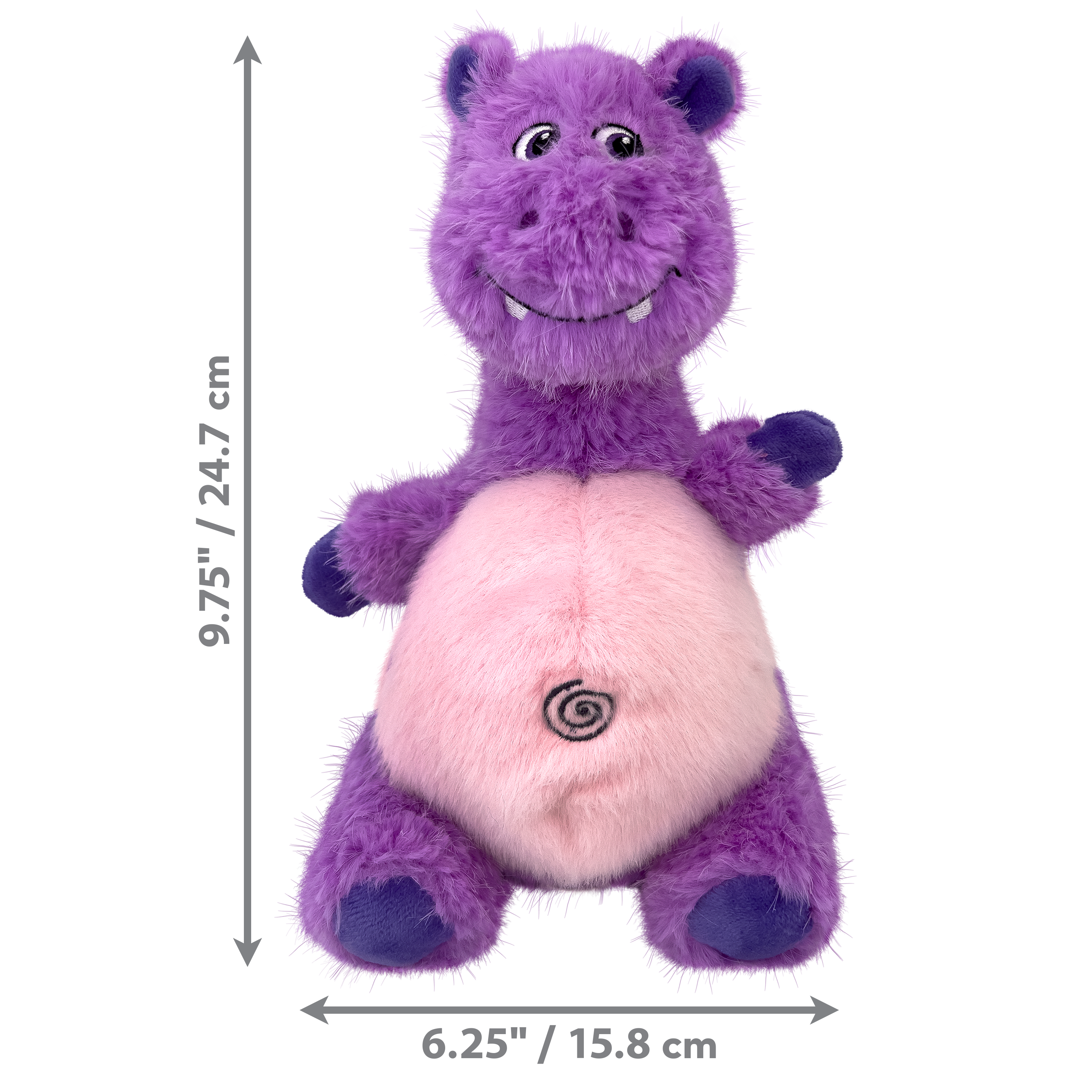 KONG Knots Belly Hippo is soft and cuddly on the outside with a strong, durable rope ball on the inside making its belly round and weighty. This dense internal skeleton rope ball adds heft and movement that entices instinctual thrashing, flinging, and light chewing. A squeaker in this purple hippo’s head piques dogs’ interest and adds excitement to play sessions. Knots Belly Hippo is also ideal for dogs who like to carry their toys, as well as for naptime snuggles. Have fun watching which way your dog likes to engage with this multifunctional toy!