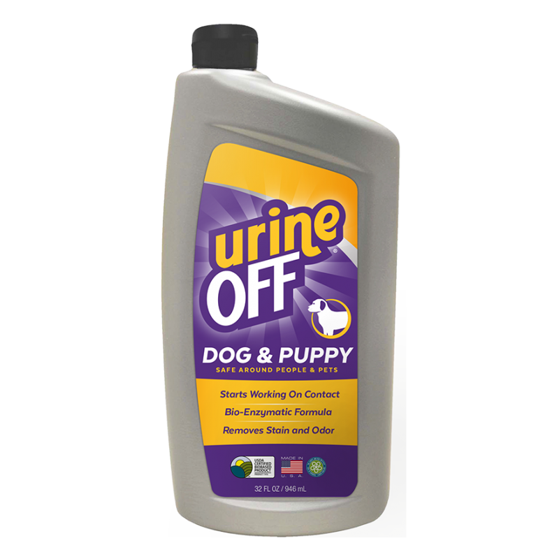 Urine Off Dog & Puppy Formula is a veterinarian-recommended product for canine urine odor and stain removal. Urine Off Dog & Puppy Formula uses bio-enzymatic technology to permanently eliminate your dog or puppy’s urine stains and odors from virtually any surface. The combination of micro-organisms and their enzymes in our non-pathogenic bacteria work together to breakdown the uric acid that produces urine’s pungent aroma and the urea that sticks to the surface, effectively removing all components of the urine, when used as directed. Urine Off is a USDA Certified Biobased Product and holds the Carpet and Rug Institute’s Seal of Approval. Urine Off is safe to use around pets and people.