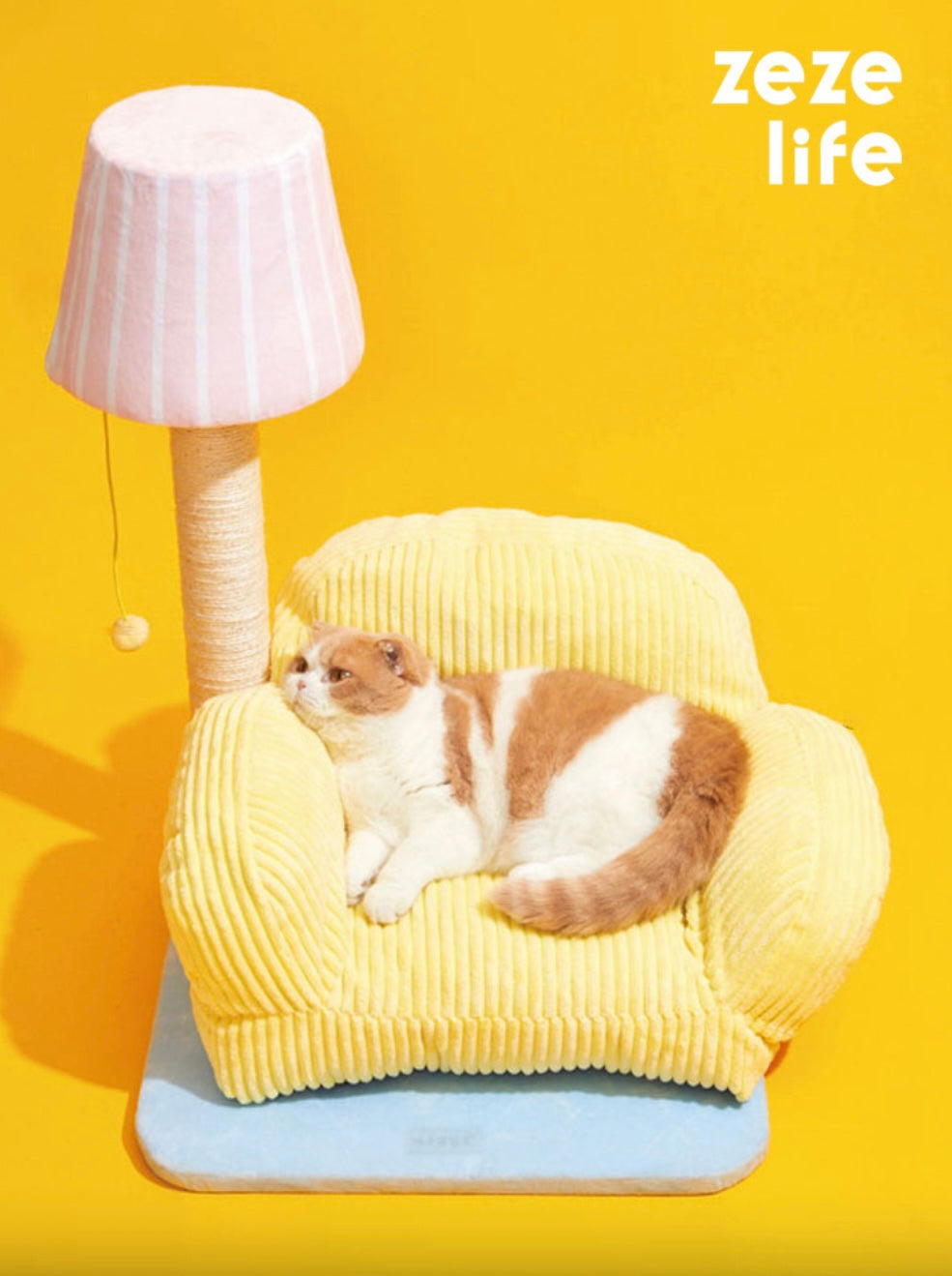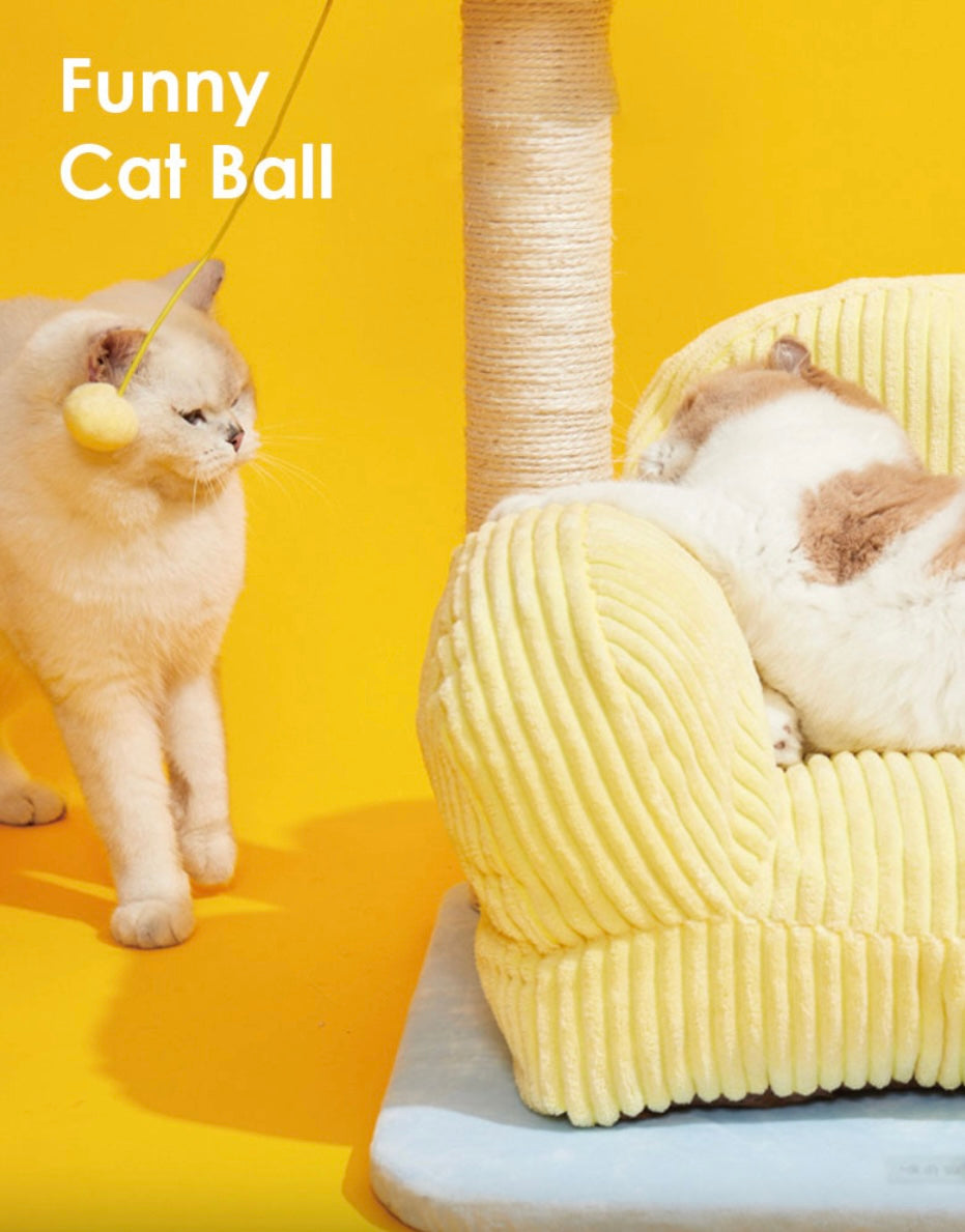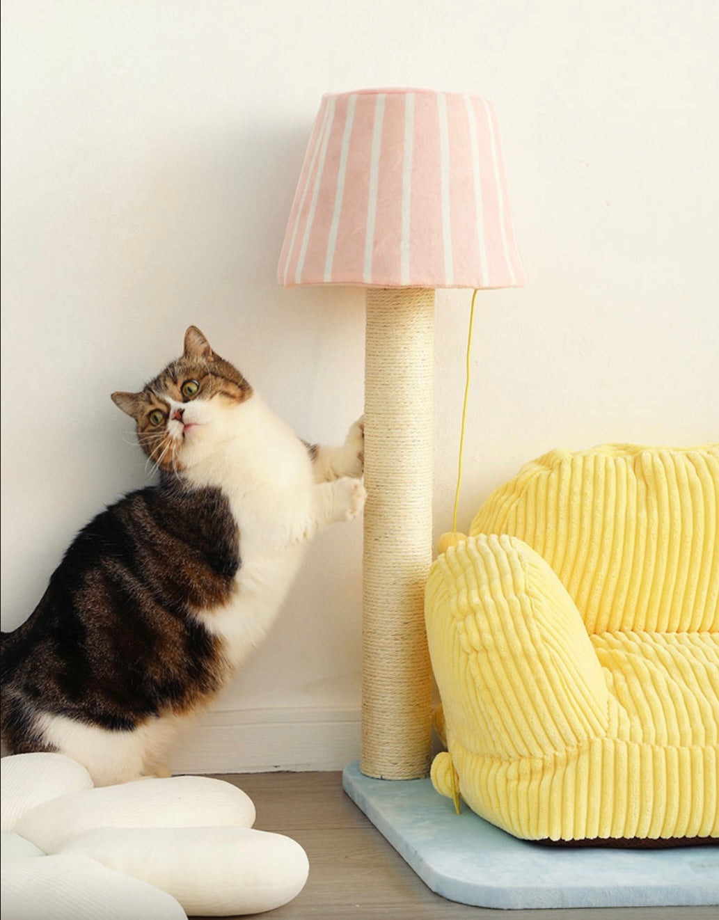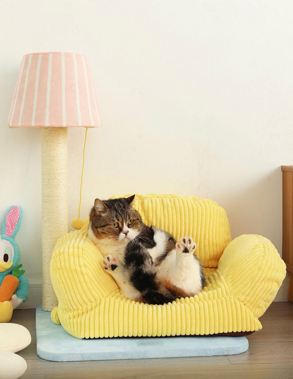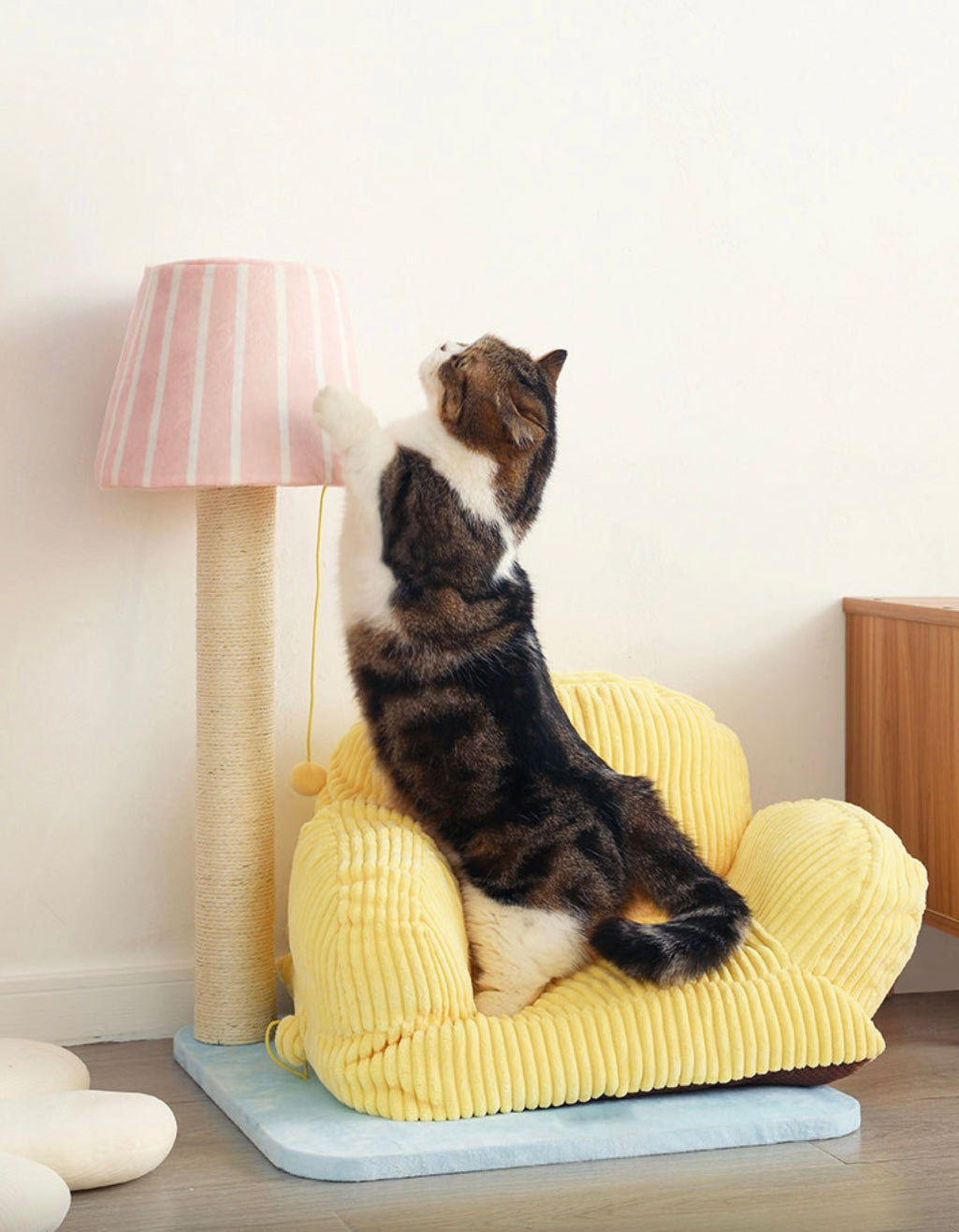 The lazy kitten lounged on the yellow cat sofa, ignoring the lamp shaped cat scratching post beside it. But curiosity eventually won, and the kitten began scratching away, pleased by the satisfying texture. The lamp post proved to be a new favorite toy, and the cat bed the perfect napping spot.