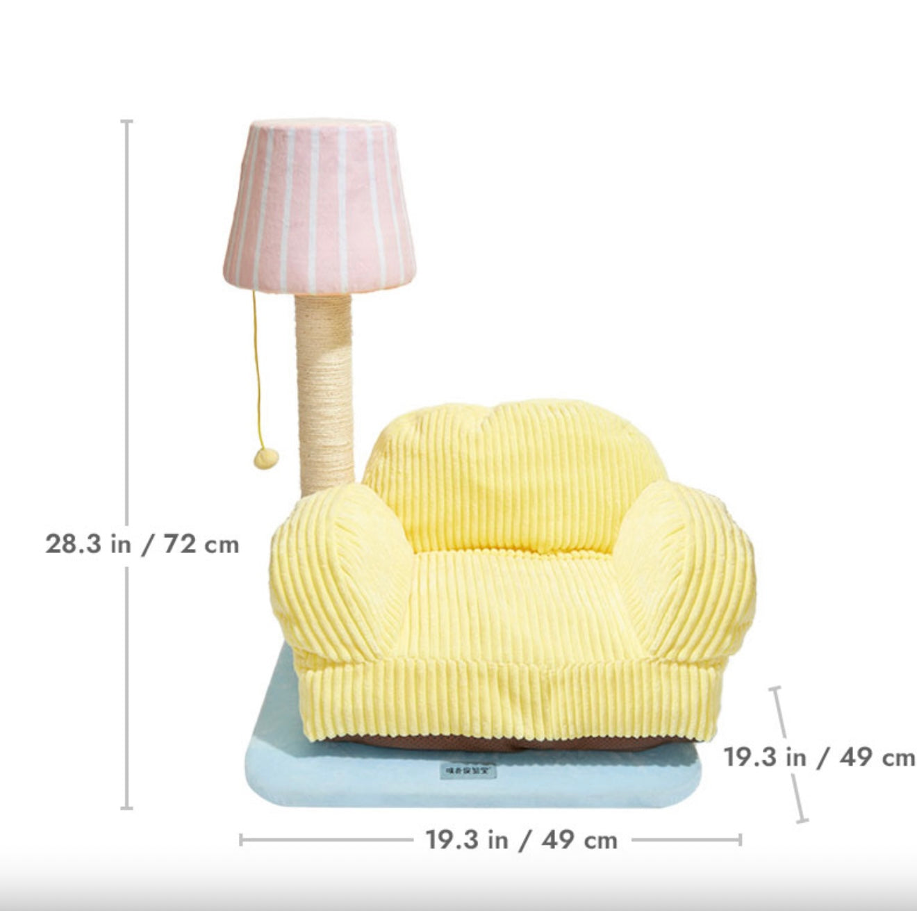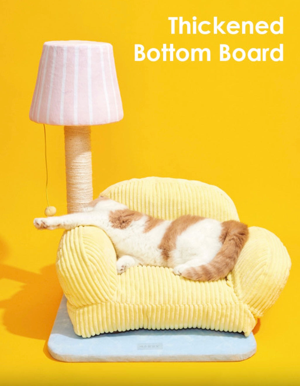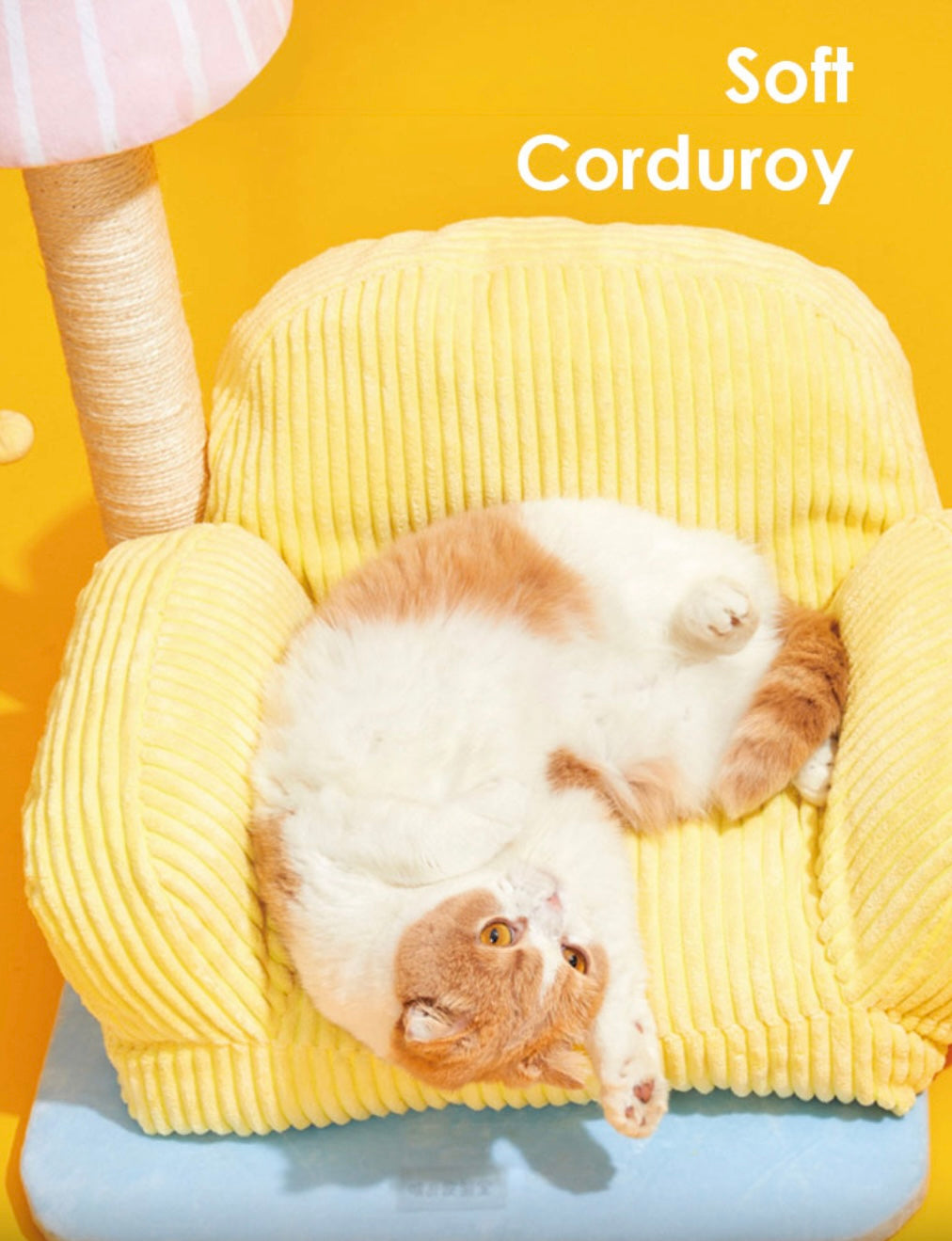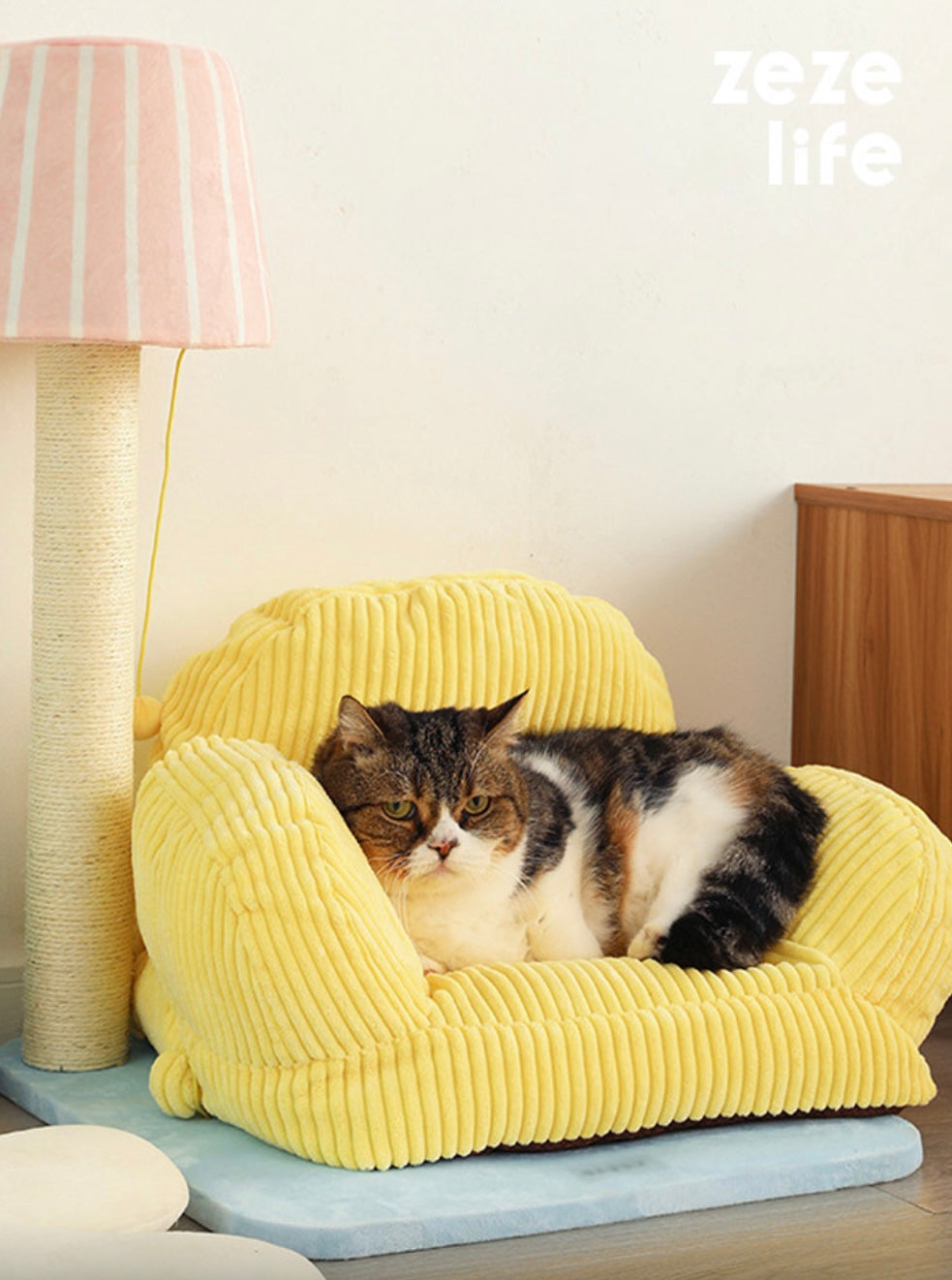 The lazy kitten lounged on the yellow cat sofa, ignoring the lamp shaped cat scratching post beside it. But curiosity eventually won, and the kitten began scratching away, pleased by the satisfying texture. The lamp post proved to be a new favorite toy, and the cat bed the perfect napping spot.