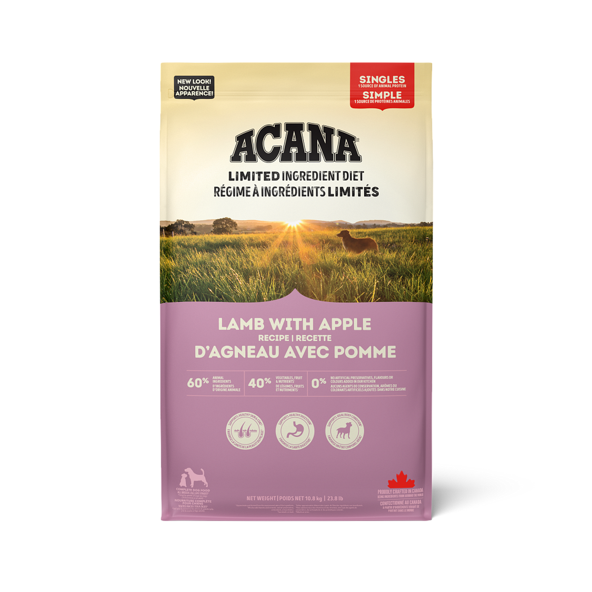 In premium ACANA™ recipes, every ingredient matters. That’s why our ACANA Singles Limited Ingredient Diet Recipes are thoughtfully crafted with protein from a single animal source*, making them perfect for picky pups or dogs with food sensitivities! Our Lamb & Apple Recipe includes 60% protein-rich lamb ingredients** balanced with 40% vegetables, fruit and nutrients*** like nutritious apples, and no grain ingredients****. It also includes no artificial preservatives, flavours or colours added in our kitchen. This recipe helps support 3 key health benefits for your dog, including healthy skin & coat, healthy digestion and ideal body condition. It helps your dog feel so good on the inside, you’ll see it on the outside!