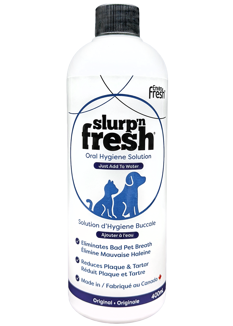 Slurp’n Fresh uses a specialized blend of natural plant extracts to eliminate odor producing compounds which cause bad pet breath. These same compounds are commonly associated with tooth decay and gum disease.