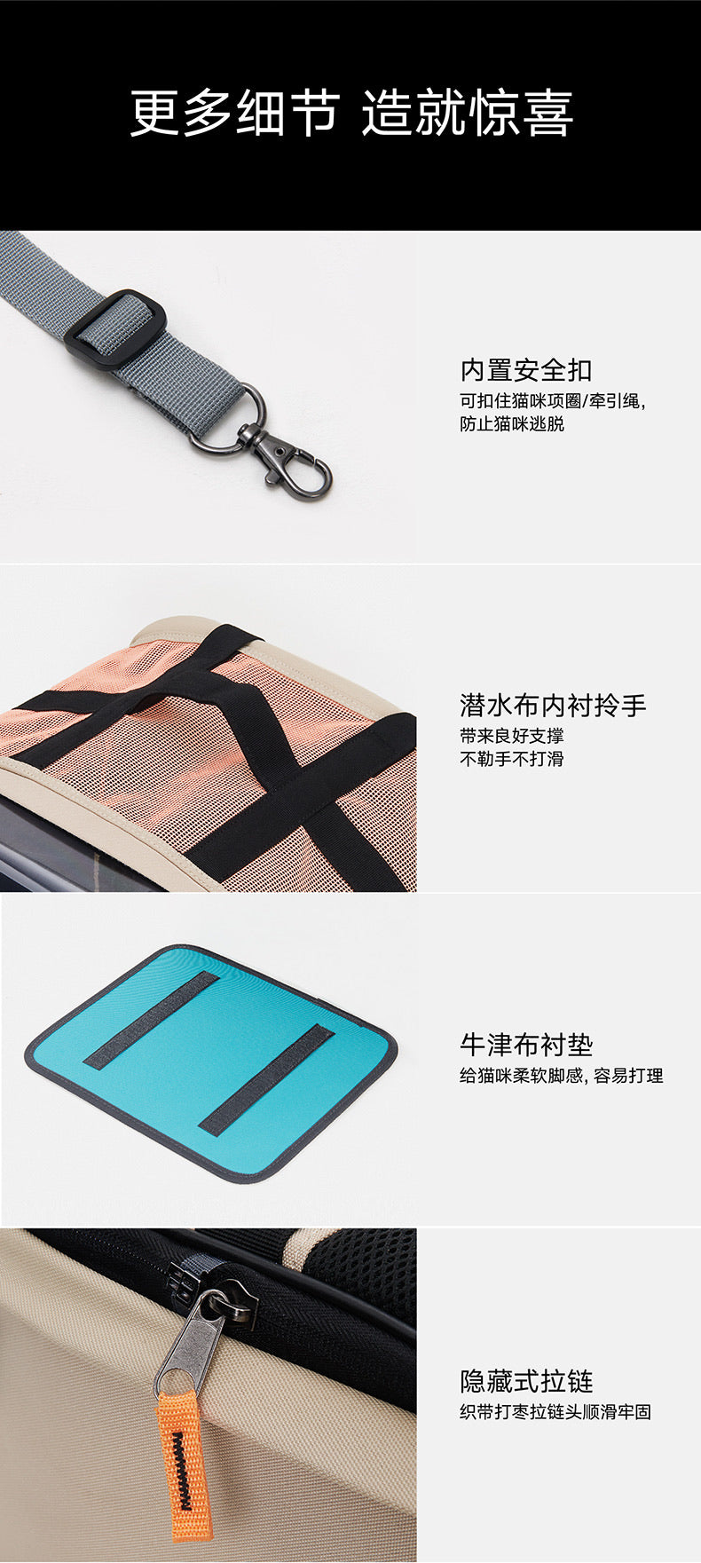 尺寸为 40.6 x 38 x 53.2 厘米,内部非常宽敞舒适,让您的宠物感到轻松自在。该包的容积为 70 升,重量仅为 1900 克,与笔记本电脑差不多。